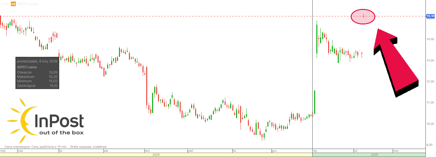 Na dzisiejszej sesji akcje InPostu mocno zareagowały na ogłoszone wezwanie oraz perspektywę wycofania spółki z obrotu. W ciągu dnia kurs rósł w okolice 15 EUR (wobec ok. 13 EUR przed ogłoszeniem transakcji), co oznacza, że łączny ruch od pojawienia się informacji przekroczył 20%, a w ujęciu 5-dniowym wyniósł ponad 13%. Mimo wybicia notowania wciąż pozostają poniżej ceny z wezwania. Rynek interpretuje to jako dyskonto za czas oraz ryzyko domknięcia procesu. Towarzyszy temu podwyższony wolumen sugerujący rotację akcjonariatu i dominację „gry pod wezwanie” nad bieżącą analizą fundamentalną.
