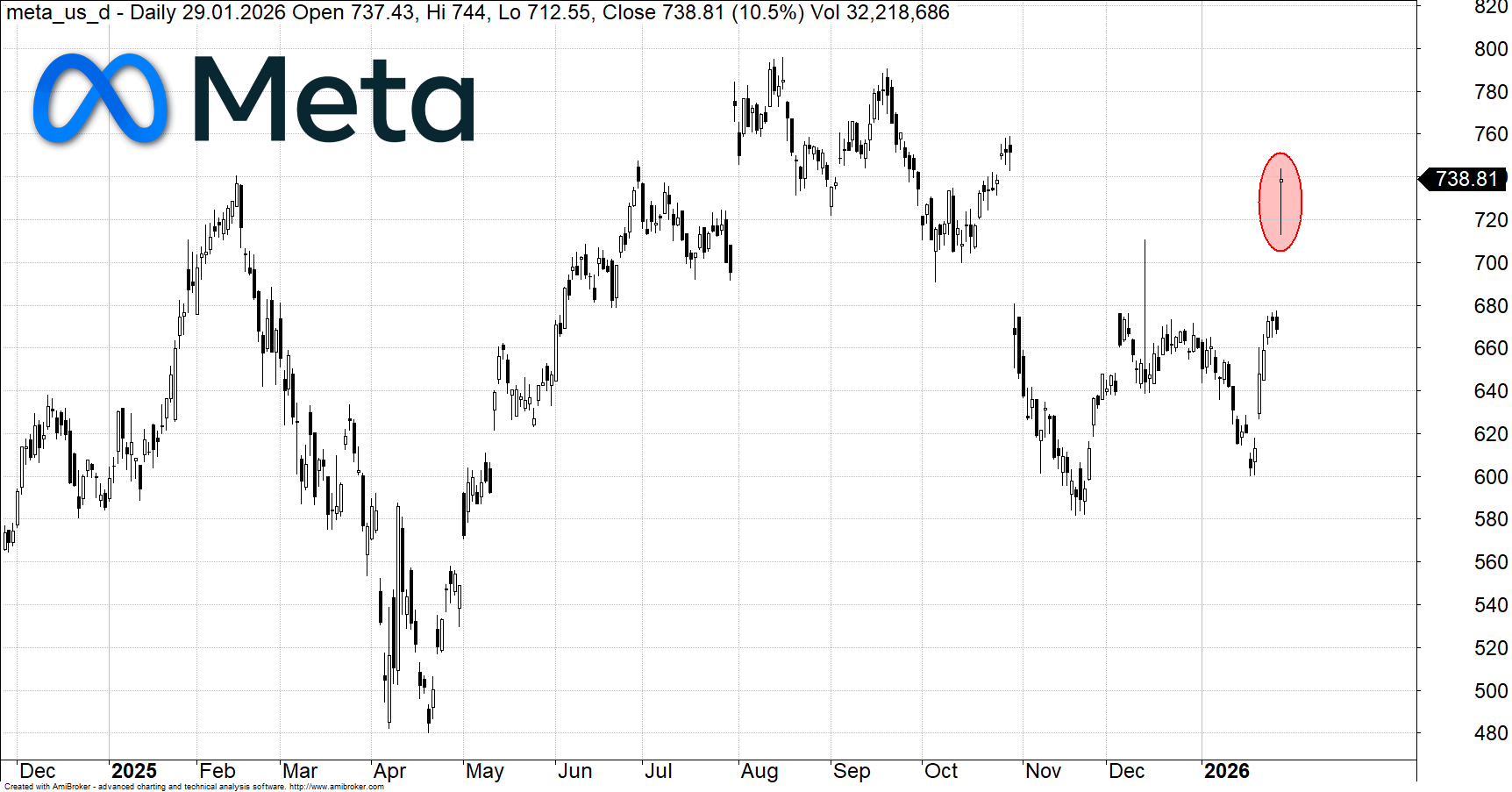Meta Platforms (META) poszła w odwrotną stronę. Po raporcie za IV kwartał, również lepszym od oczekiwań na poziomie przychodów i zysków, akcje w handlu porannym rosły o ponad 8%, a w pewnym momencie około 10%. Kurs wspiął się do najwyższych poziomów od końcówki października. Dodatkowo Mark Zuckerberg zapowiedział, że spółka wyda w tym roku nawet 135 mld USD na inwestycje w AI - to wzrost o 87% względem ubiegłorocznego rekordu.