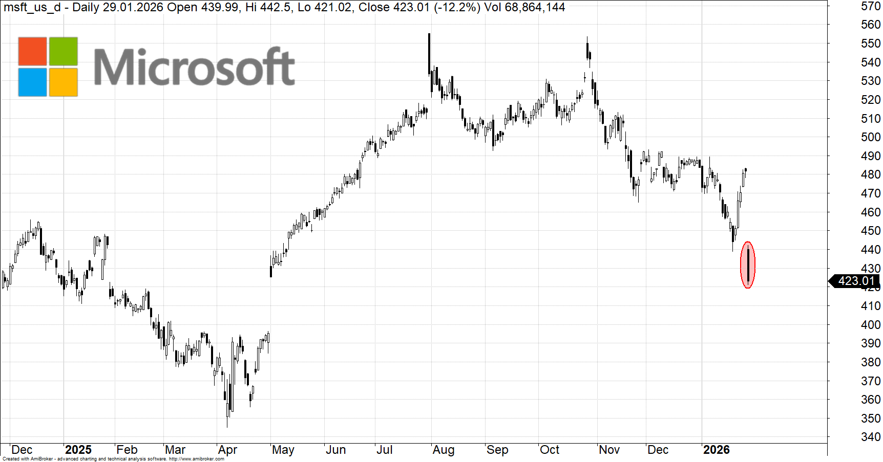 W czwartek Microsoft (MSFT) spadł o ponad 10%, w pewnym momencie około 12%. To przedłużyło jego półroczny zjazd do około 16% i ustawiło sesję na najgorszą jednodniową od niemal pięciu lat. Problem w tym, że spółka jednocześnie przebiła rynkowe prognozy sprzedaży i zysku w aktualizacji wyników za fiskalny II kwartał. Kara przyszła gdzie indziej - za sygnał słabszego tempa wzrostu w kluczowej chmurze.