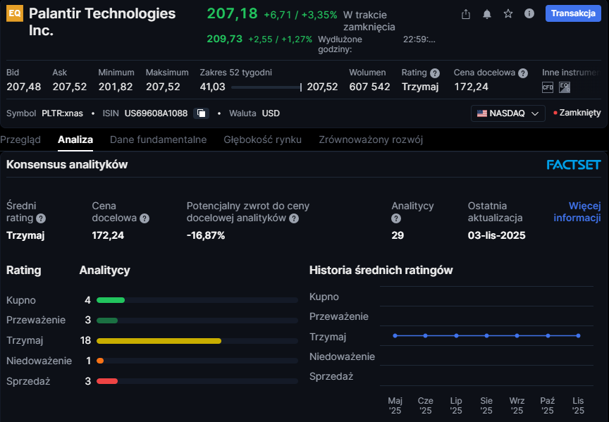 W danych z Saxo Banku (na bazie FactSet) widać, jak bardzo rynek jest podzielony. Średni rating na Palantirze to „Trzymaj”, a średnia cena docelowa 172,24 USD, co przekłada się na oczekiwany spadek o ok. 17% względem bieżącej ceny. Z 29 analityków tylko 4 rekomenduje „Kupuj”, 3 „Przeważaj”, aż 18 mówi „Trzymaj”, 1 „Niedoważaj”, a 3 „Sprzedaj”. Od maja do listopada 2025 średni rating nie rusza się z poziomu „Trzymaj” - wyniki są imponujące, ale przy obecnej wycenie większość analityków woli zostać na płocie niż gonić kurs.