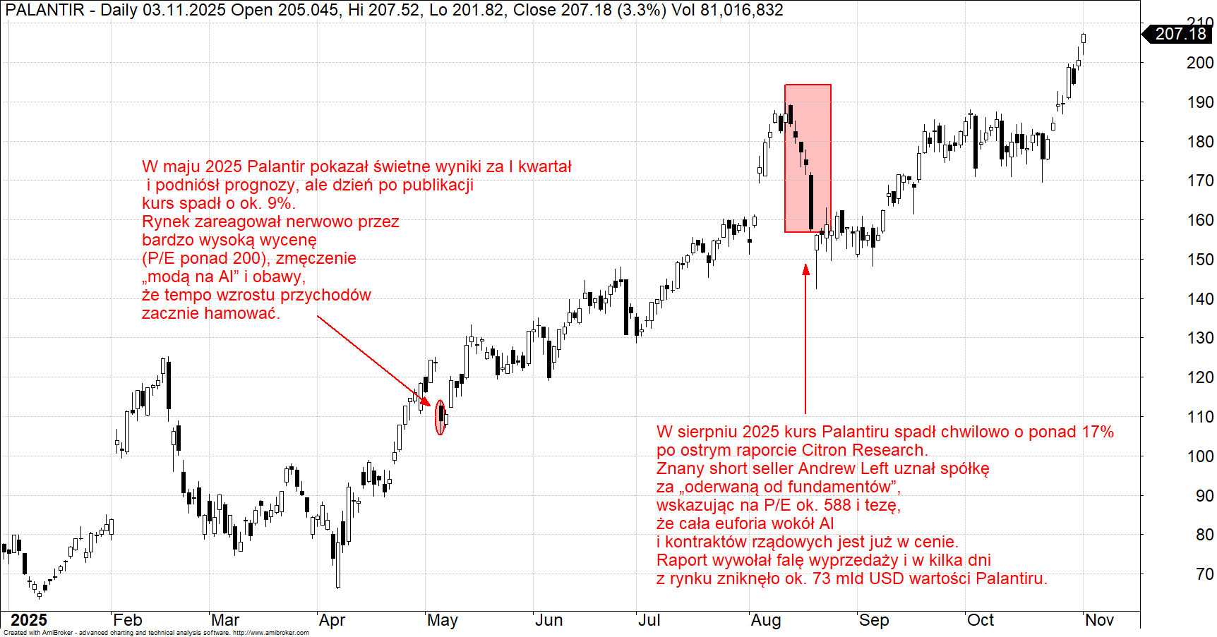 Takie tempo wzrostu nie pozostaje bez wpływu na notowania. Kurs Palantiru wzrósł w tym roku o 174%, podczas gdy szeroki indeks S&P 500 zyskał ok. 16%. W dniu publikacji wyników akcje osiągnęły historyczne maksimum w trakcie regularnej sesji.