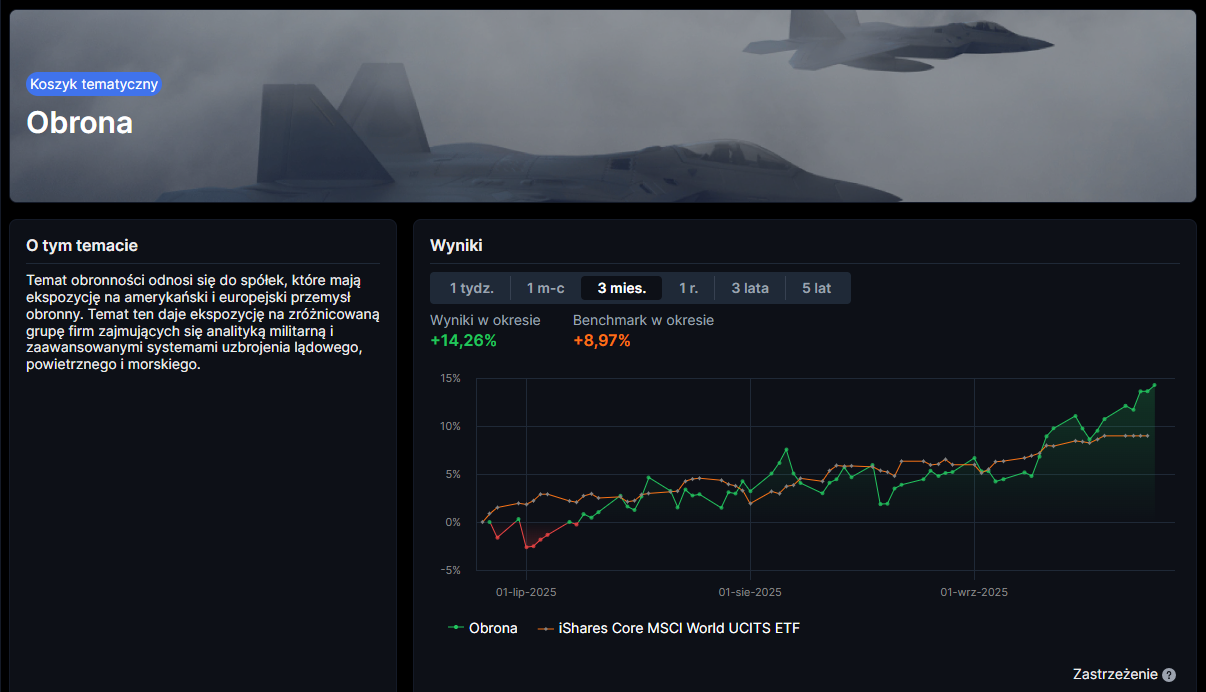 Na sesji, której ton nadały doniesienia „WSJ”, indeks S&P 500 wzrósł o 0,3%, a Dow Jones o 0,2%. Średnio spółki obronne podbiły o ok. 0,6%, a w szczycie dnia zyski sięgały 2,2%. W ujęciu spółek: Lockheed Martin zakończył dzień na +0,93%, General Dynamics na +0,55%, L3Harris na +1,15%, Northrop Grumman lekko pod kreską (-0,09%). RTX zaliczył poprawę nastroju wokół rakiet, choć bez podanego precyzyjnego odczytu dziennego. W tle dobrze radził sobie koszyk obronny Saxo - zestaw spółek zbrojeniowych jak na załączonym wykresie - który w ujęciu 3-miesięcznym pokazał +14,26% wobec +8,97% dla benchmarku. Z firm wymienionych w tekście w skład koszyka wchodzą: Lockheed Martin, Northrop Grumman i RTX; poza nim pozostają General Dynamics oraz L3Harris.