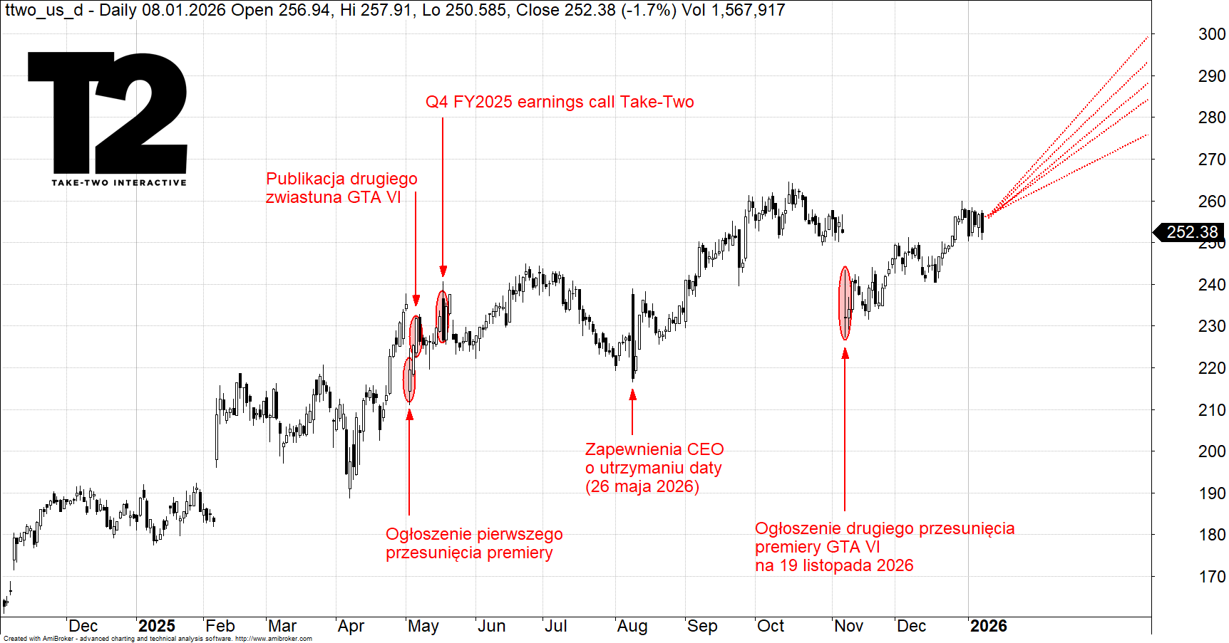 Jednocześnie widać hamulce. Take-Two jest wyceniane wysoko - wskaźnik P/S ma wynosić 7,6x przy średniej branżowej 1,6x, a ten mnożnik bywa w takich przypadkach bardziej użyteczny niż P/E, gdy zyski są pod presją i wynik potrafi mocno falować. Spółka zaliczyła też miss na EPS w Q2 roku obrachunkowego 2026: -0,73 USD wobec oczekiwanych 0,94 USD. Największe ryzyko jest jednak oczywiste - opóźnienie GTA VI, które historycznie potrafiło obniżać kurs o ok. 10%. Dodatkowo w listopadzie zaobserwowano spadki w GTA V i NBA 2K26, co sugeruje pewną stagnację w dojrzałych tytułach.