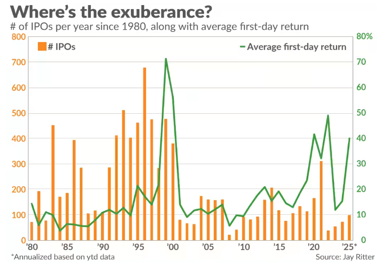 Na marginesie warto wrócić do analizy MarketWatch sprzed tygodnia: „gorący” kalendarz debiutów nie oznacza automatycznie bańki. Na wykresie opartym na danych prof. Jaya Rittera z University of Florida widać, że dzisiejsze „gorąco” jest bliżej wieloletniej średniej niż szczytów euforii. Co ważne, metodologia Rittera wyłącza emisje poniżej 5 USD, więc porównania nie są zaburzone przez penny stocks. Innymi słowy: selekcja i rentowność ważniejsze niż pogoń za widowiskiem.
