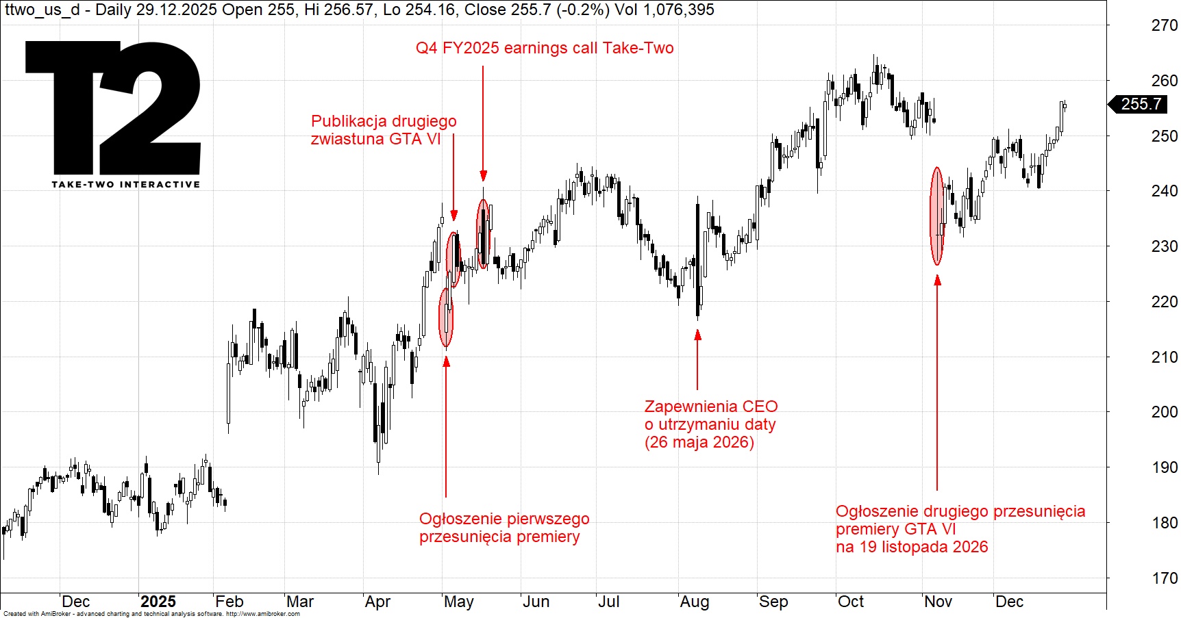 - 6 listopada 2025 - drugie przesunięcie premiery: Rockstar Games podaje, że GTA VI zostaje przesunięte o kolejne 6 miesięcy - z 26 maja na 19 listopada 2026 r. Akcje Take-Two spadają o ok. 6% w handlu posesyjnym do ok. 255 USD.
