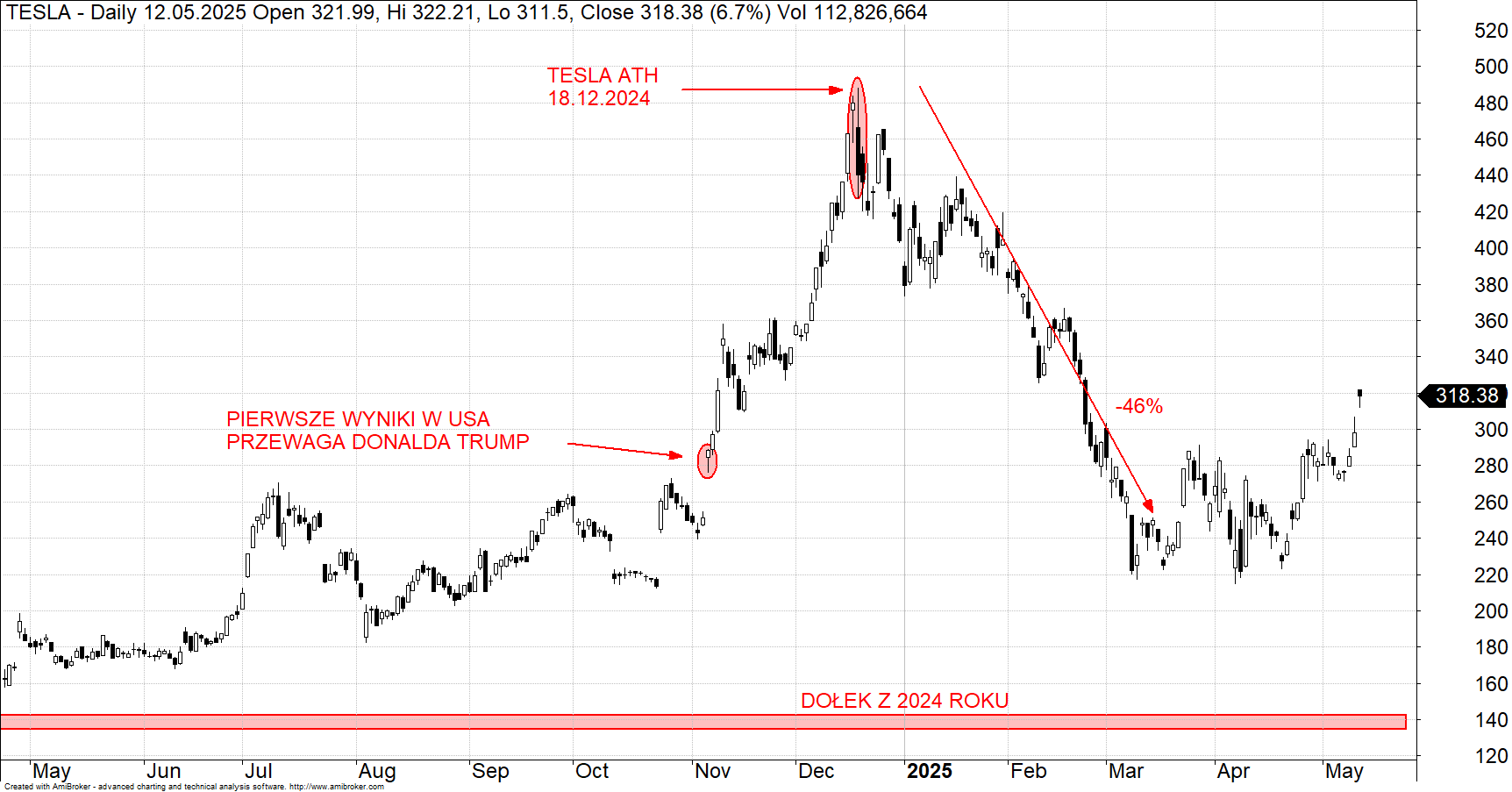 W samym kwietniu sprzedaż Tesli w Chinach spadła o niemal 9% rok do roku. Inwestorzy mogą zatem liczyć, że poprawa relacji handlowych przywróci chińskim konsumentom apetyt na amerykańskie produkty – a więc również na Teslę.