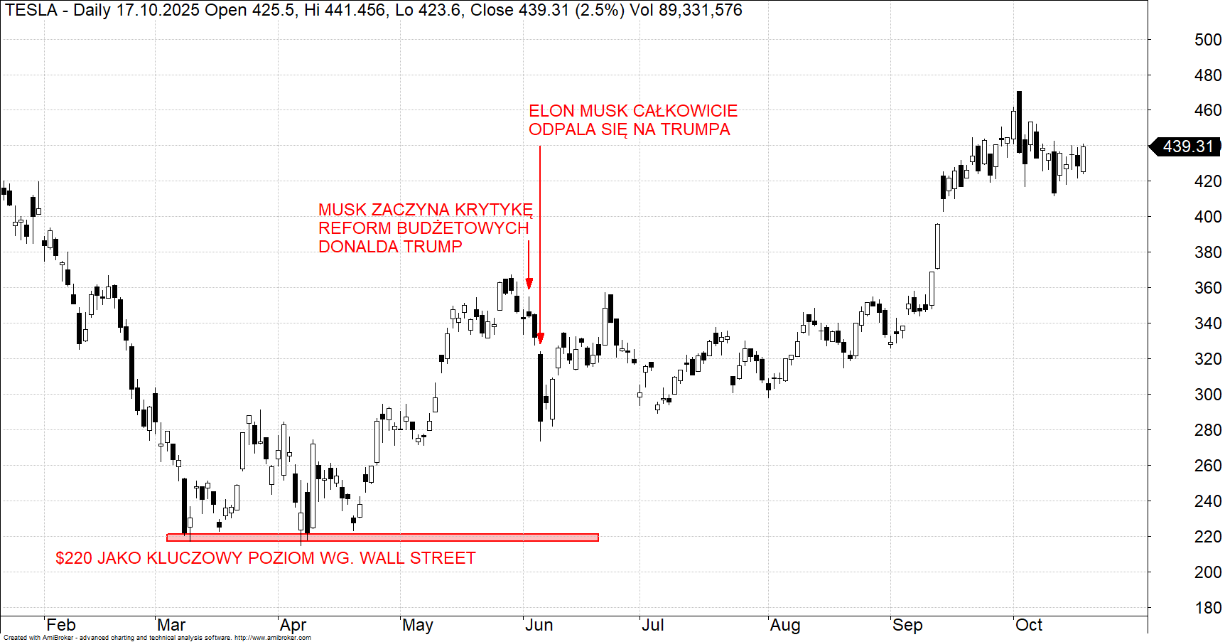 Notowania też nie biorą jeńców. Przed piątkową sesją akcje były wyżej o ok. 6% od początku roku i aż o 94% w ujęciu 12 miesięcy. Zmienność przyspieszyła: w ostatnich 30 sesjach kurs poruszał się średnio o 2,7% w górę lub dół, a w 13 przypadkach wybicie przekraczało 3%. W samym tygodniu Tesla zyskała 6,2%, odrabiając spadek 3,8% z tygodnia wcześniejszego.