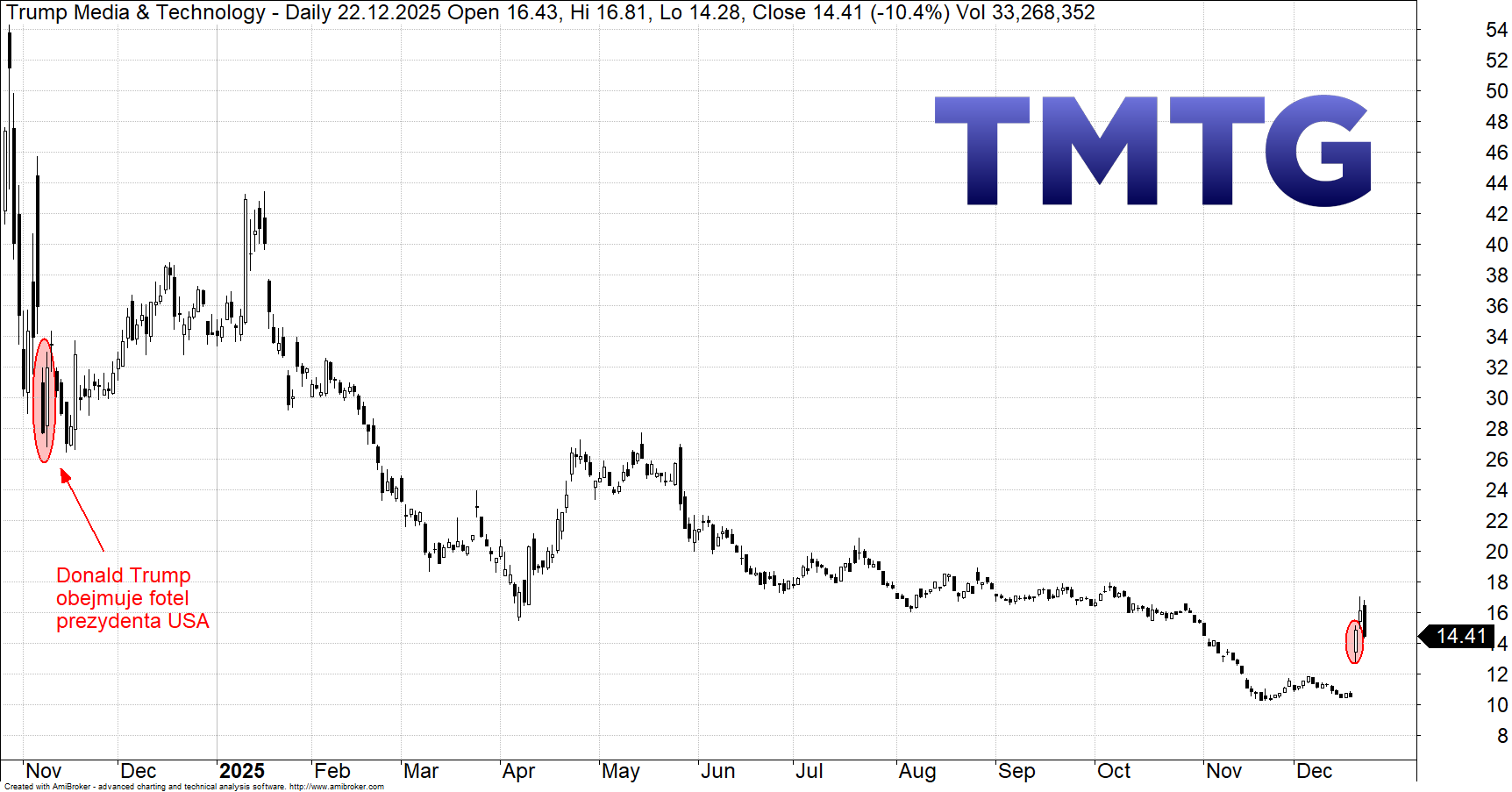 Tyle że w momencie, gdy część inwestorów dopisywała dalszy ciąg, rynek przypomniał, że DJT lubi gwałtowne zwroty akcji. W chwili, o której piszą amerykańskie serwisy rynkowe, akcje były niemal 10% na minusie w trakcie dnia, a kurs kręcił się w okolicach 16,08 USD.
