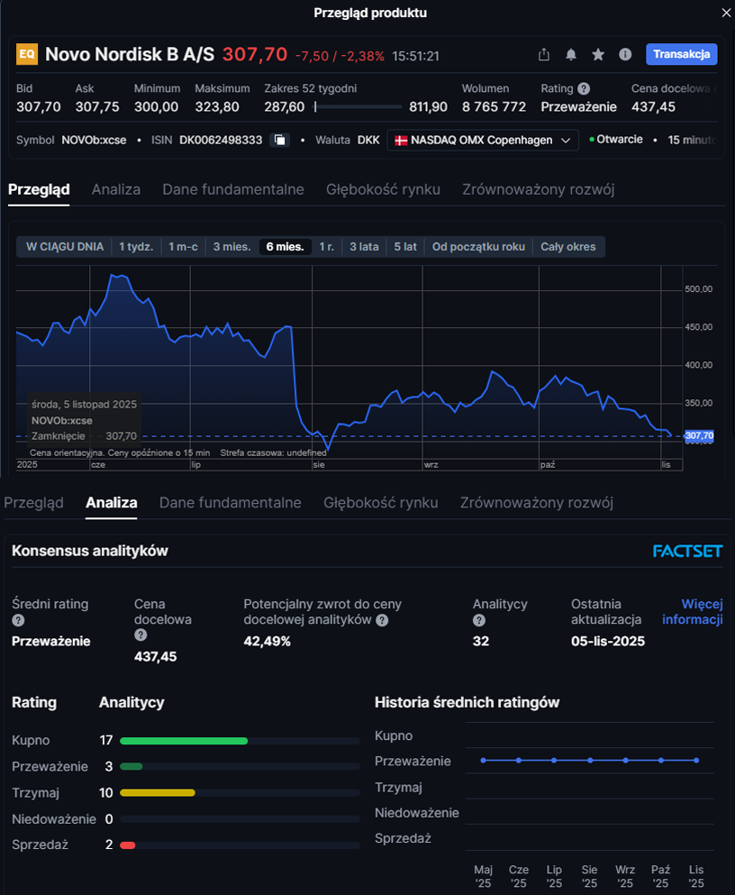 Warto też zwrócić uwagę na farmację. Novo Nordisk pojawia się w danych dwa razy - jako akcje z Kopenhagi (seria B) i jako notowane w Nowym Jorku ADR-y. Po spektakularnym rajdzie na lekach odchudzających przyszedł czas głębokiej korekty: kurs w ciągu 12 miesięcy spadł o ok. 56-59 %. Mimo tego polscy inwestorzy nie odwrócili się od spółki, co sugeruje raczej próbę rozegrania odbicia niż paniczną ucieczkę.