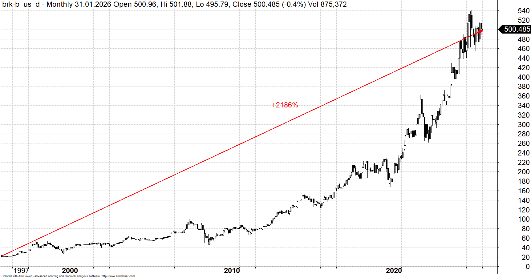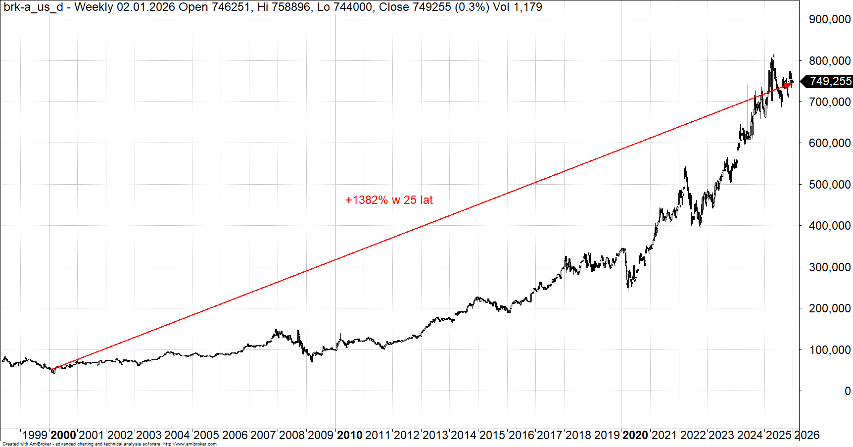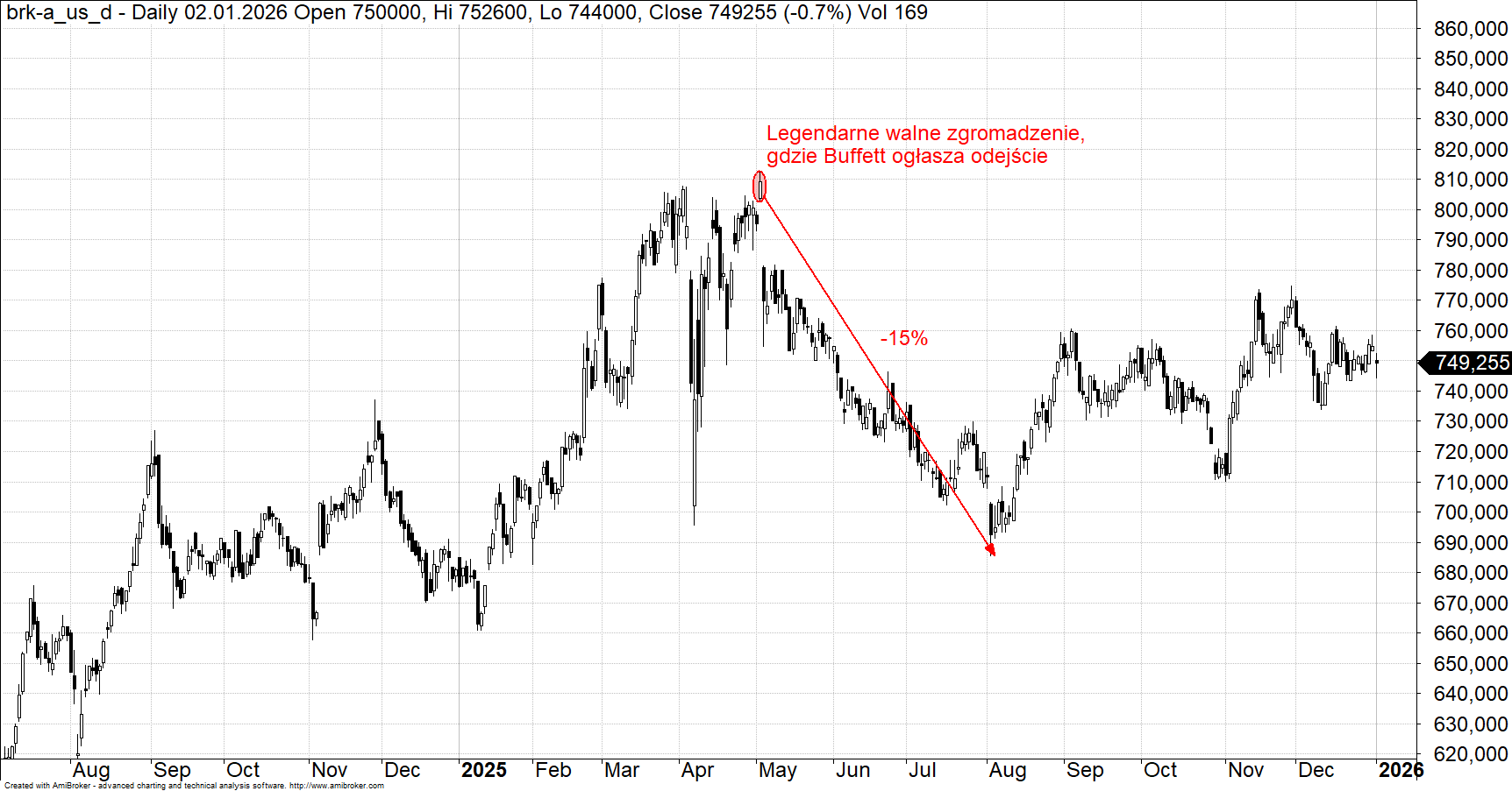 Rok zaczyna się od twardego porównania. Akcje klasy B Berkshire są w 2025 roku na plusie o 11%, podczas gdy S&P 500 zyskuje 17%. Jednocześnie akcje pozostają poniżej poziomów ok. 530 USD, z których osunęły się po tym, jak Buffett na początku maja zapowiedział odejście z funkcji CEO.