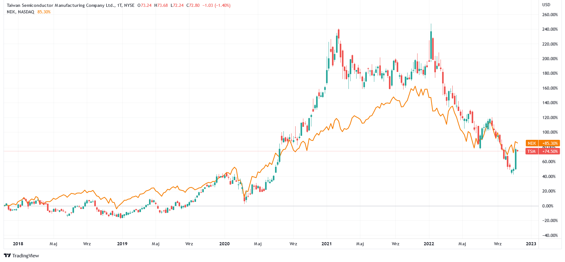 Notowania TSM na tle indeksu Nasdaq Composite – 5 lat
