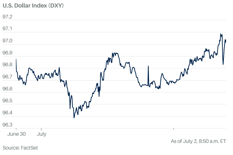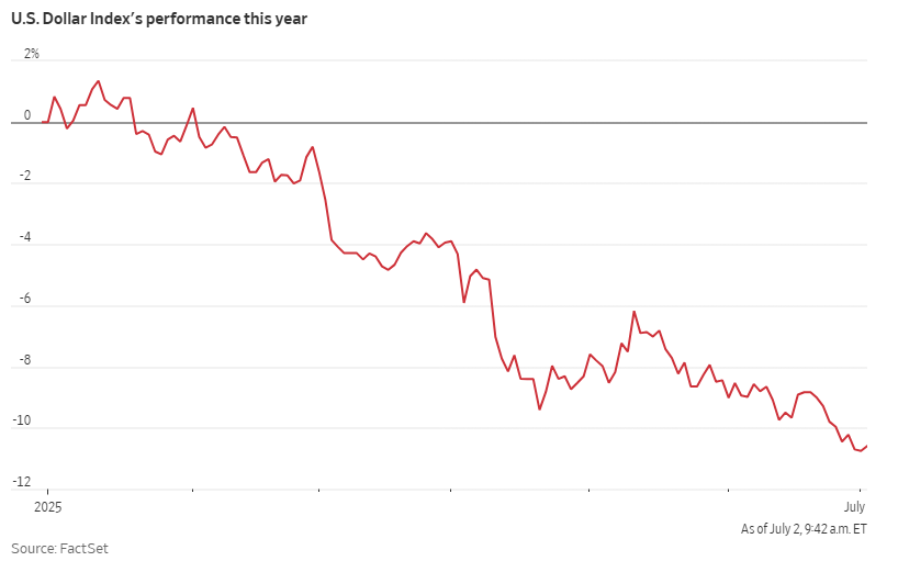 Indeks dolara, który mierzy siłę "zielonego" w relacji do koszyka najważniejszych walut świata, od początku 2025 roku spadł już o ponad 10%. To najgłębszy spadek w historii tych danych, sięgającej 1985 roku. Jeszcze gorzej wygląda to w ujęciu szerszym — indeks dolara publikowany przez „Wall Street Journal”, obejmujący więcej walut niż standardowy koszyk ICE, zniżkuje o ponad 8%, co oznacza najgorsze pierwsze półrocze dla dolara od 2002 roku.