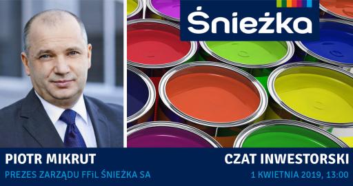 Czaty 01.04.2019 0 Sytuacja finansowa i plany rozwoju Grupy Kapitałowej Śnieżka po publikacji wyników za 2018 rok - czat inwestorski z Prezesem Zarządu, Piotrem Mikrutem