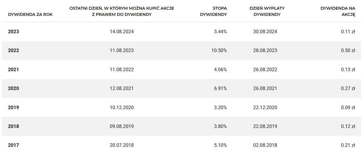 Spółka od wielu lat wypłaca dywidendę, z wyjątkiem dywidendy za rok 2024, co wynikało z zwiększonego wysiłku inwestycyjnego i organizacyjnego przejęcia N/Z.