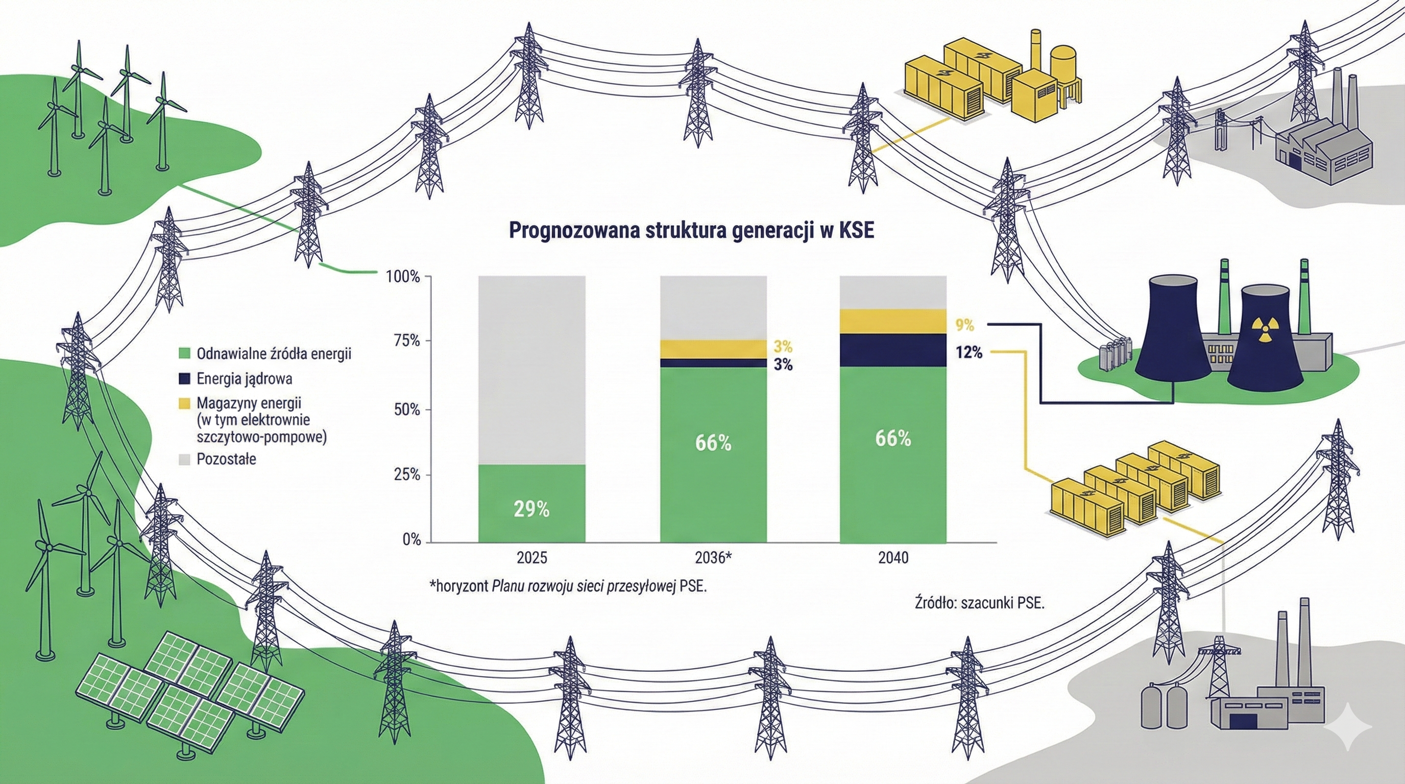 Polskie Sieci Elektroenergetyczne (PSE) opublikowały strategię do 2040 roku, definiując swoją rolę w zmieniającym się krajobrazie energetycznym jako „strażnika i architekta”. Dokument jest odpowiedzią na bezprecedensowe wyzwania wynikające z rewolucji technologicznej i zmian geopolitycznych, które gruntownie przebudowują system elektroenergetyczny. Operator systemu przesyłowego stawia sobie za cel nie tylko zapewnienie bezpieczeństwa dostaw, ale także aktywne kształtowanie rynku i infrastruktury w sposób umożliwiający osiągnięcie neutralności klimatycznej.