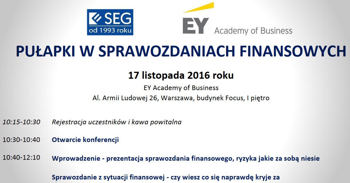 17 listopada 2016 roku odbędzie się konferencja "Pułapki w sprawozdaniach finansowych" organizowana przez Stowarzyszenie Emitentów Giełdowych oraz EY Academy of Business. Konferencja skupia się na obszarach rachunkowości finansowej, które w największym stopniu opierają się na oszacowaniach dokonywanych przez zarządy i/lub wiążą się ze złożonymi i często zmieniającymi się zasadami ujmowania i pomiaru.