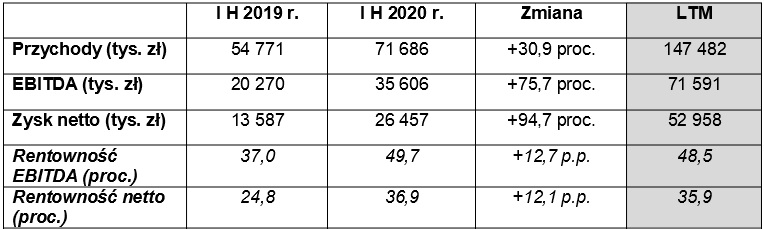Mo-BRUK w pierwszym półroczu 2020 r. wypracował 71,7 mln zł przychodów ze sprzedaży, 35,6 mln zł EBITDA (zysk operacyjny powiększony o amortyzację) oraz 26,5 mln zł zysku netto. Oznacza to wzrost rok do roku odpowiednio o 30,9 proc., 75,7 proc. oraz 94,7 proc.