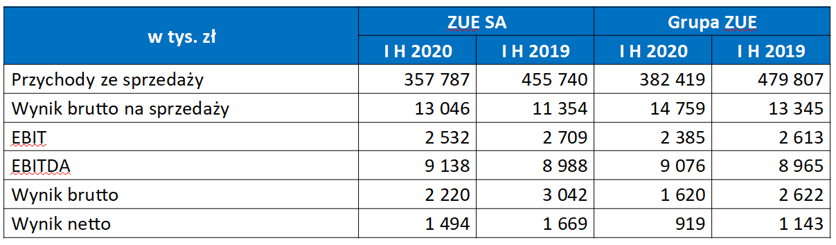 Skonsolidowane przychody Grupy ZUE w I półroczu 2020 roku wyniosły 382,4 mln zł. Zysk brutto na sprzedaży sięgnął 14,8 mln zł, a wynik EBITDA wyniósł 9,1 mln zł. Wynik operacyjny Grupy wyniósł 2,4 mln zł, a zysk netto: 0,9 mln zł. Marża brutto na sprzedaży Grupy ZUE rdr wzrosła z 2,8% do 3,9%.