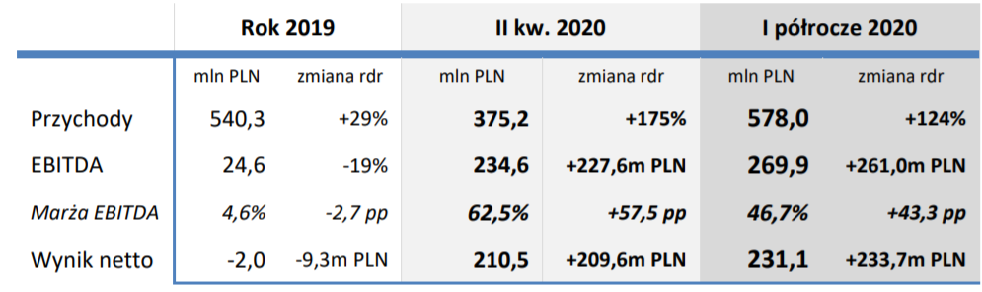Krakowski producent rękawic medycznych i dystrybutor materiałów medycznych jednorazowego użytku, spółka Mercator Medical, zanotowała w pierwszej połowie 2020 roku 269,9 mln zł skonsolidowanego wyniku EBITDA i 231,1 mln zł zysku netto przy 578 mln zł przychodów, potwierdzając tym samym kontynuację pozytywnych trendów, obserwowanych w poprzednim kwartale. Jednocześnie Grupa Mercator Medical wygenerowała 194,6 mln zł gotówki z działalności operacyjnej.