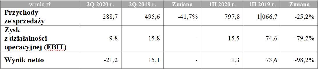 W pierwszym półroczu 2020 r. zysk EBIT wyniósł 15,5 mln zł, tj. był o 79,2% niższy w ujęciu rok do roku. W samym II kwartale wynik EBIT wyniósł -9,8 mln zł, wobec 15,8 mln zł w II kwartale 2019 r.