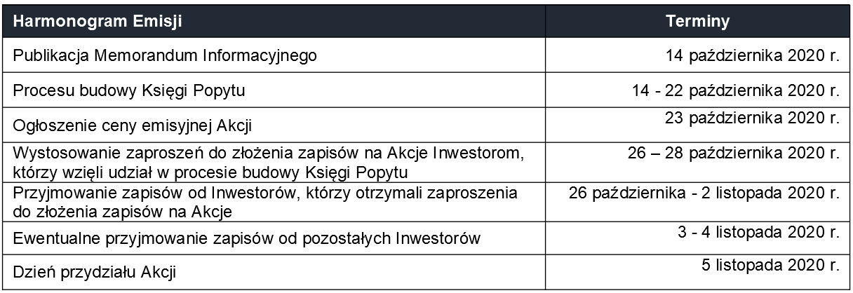 W związku z dużym zainteresowaniem w procesie budowy księgi popytu, Spółka Genomtec poinformowała również o zmianie w harmonogramie emisji akcji. Od 26 października do 28 października 2020 roku będą wysyłane zaproszenia do składania zapisów na akcje do inwestorów, którzy wzięli udział w budowie księgi popytu. Od 26 października do 2 listopada 2020 roku będą od tych inwestorów przyjmowane zapisy i wpłaty na akcje.