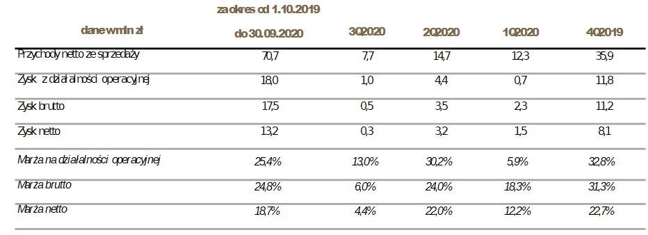 Ponad 7,7 mln zł przychodów netto ze sprzedaży wypracowała w trzecim kwartale br. Grupa CI Games. To 75 proc. więcej w porównaniu do wyniku uzyskanego przez Grupę w okresie lipiec-wrzesień 2019 roku. W trzecim kwartale skonsolidowany zysk netto wyniósł 0,34 mln zł, w stosunku do 2,9 mln zł straty w analogicznym okresie 2019 r. W okresie październik 2019 - wrzesień 2020 skonsolidowane przychody netto ze sprzedaży wyniosły 70,6 mln zł, zaś zysk netto przekroczył 13,2mln zł (marża netto 18,7%). W okresie trzech kwartałów br. Grupa wygenerowała 33,5 mln zł gotówki z działalności operacyjnej.