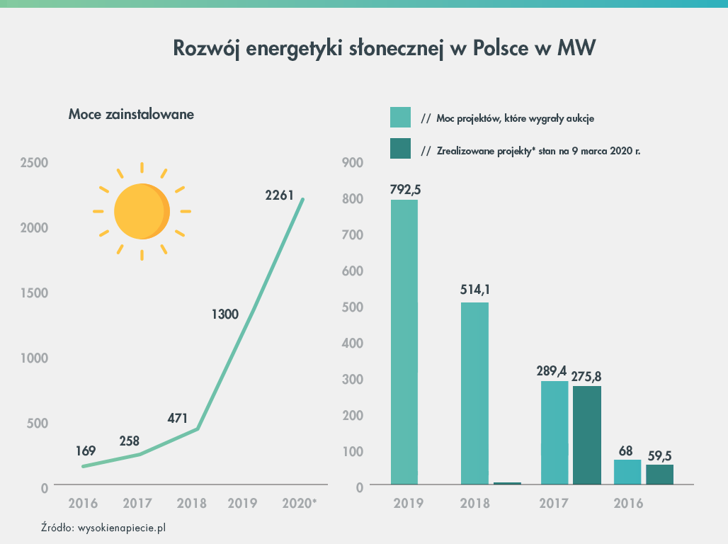 Polska w 2019 roku osiągnęła przyrost nowych mocy na poziomie około 0,9 GW, zajmując 5. miejsce wśród krajów Unii Europejskiej pod kątem przyrostu mocy fotowoltaicznej. Nowe moce w PV zainstalowane w Polsce stanowiły 5,5% nowych mocy w Unii Europejskiej1. Według Grzegorza Wiśniewskiego, prezesa Instytutu Energetyki Odnawialnej od 2019 roku polski sektor fotowoltaiki (PV) był w stanie zmobilizować więcej kapitału na realizację inwestycji niż cała energetyka konwencjonalna2. W roku 2022 wartość inwestycji PV przekroczy 5 mld zł3, a większość ekspertów jest zgodna, że rynek dużych farm PV w Polsce dopiero się rozwija4.