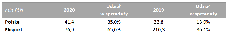 Na poziom przychodów ze sprzedaży ważny wpływ miały kontrakty z rynku ukraińskiego, a w szczególności z realizacji inwestycji dla Epicentr K LLC, z którą Grupa podpisała kontrakty w 2018 i 2019 roku. Realizacja trzeciego, ostatniego kontraktu rozpoczęła się w II kwartale 2020, a jej wpływ na wyniki był widoczny w roku ubiegłym, jak i będzie w obecnym.