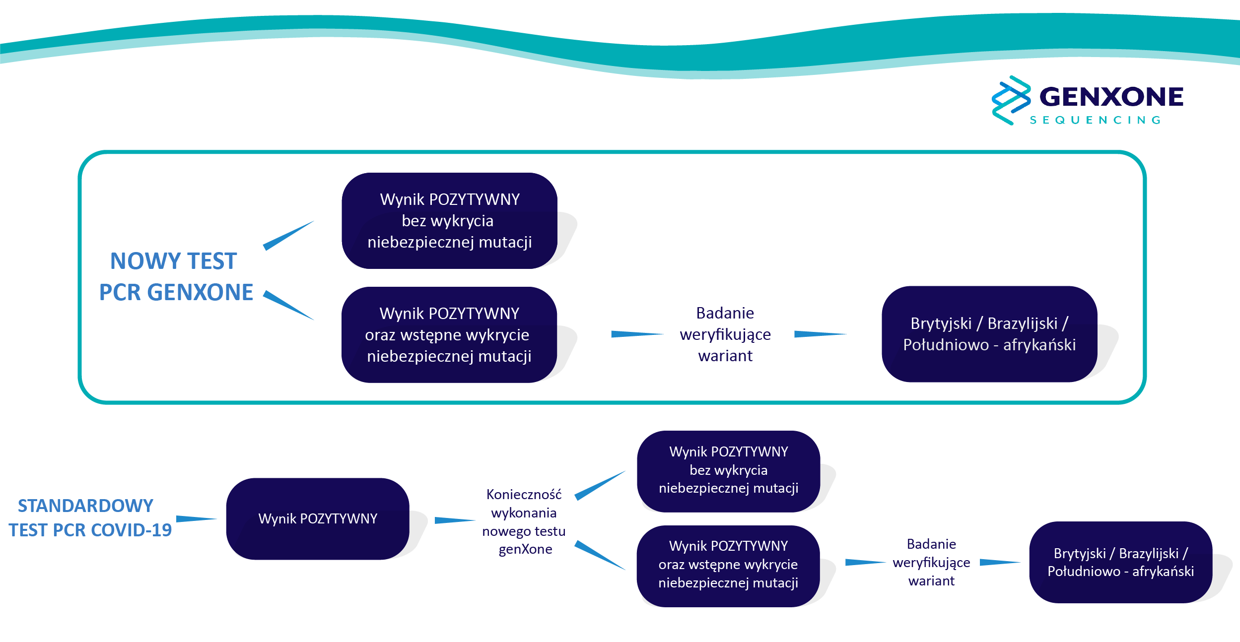 genXone od dawna wykorzystuje najbardziej zaawansowane na świecie testy diagnostyczne, bazujące na technice Real-Time PCR, które identyfikują zestaw aż 4 genów charakterystycznych dla SARS-CoV-2. Teraz testy te zostały jeszcze bardziej udoskonalone i uzupełnione o jednoczesne wskazanie występowania mutacji charakterystycznych dla wariantów uznanych za te najbardziej niebezpieczne dla zdrowia. W przypadku pozytywnego wyniku, który wskazuje na zarażenie koronawirusem SARS-CoV-2 od razu dowiadujemy się również, czy w zidentyfikowanym materiale genetycznym wirusa występują mutacje świadczące o obecności niebezpiecznego wariantu (VoC). Jeśli tak, istnieje możliwość przeprowadzenia dodatkowego testu (również Real Time PCR), który wskaże występowanie mutacji charakterystycznej dla wariantu brytyjskiego, brazylijskiego i/lub południowo-afrykańskiego. Taka informacja pozwoli jeszcze precyzyjniej i szybciej dobrać sposoby postępowania z osobą zarażoną danym wariantem mutacji koronawirusa oraz podjąć właściwe działania profilaktyczno-ochronne w otoczeniu takiej osoby.