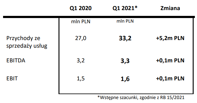 Zgodnie z opublikowanym raportem giełdowym, Grupa K2 zanotowała szacunkowo w pierwszym kwartale 2021 roku wzrost przychodów ze sprzedaży usług o 19% rdr, do 33,2 mln zł, co pozwoliło wypracować jej 3,3 mln zł wyniku EBITDA i 1,6 mln zł zysku operacyjnego. Oznacza to wzrosty wyników pomimo wysokiej bazy porównawczej – w pierwszym kwartale 2020 roku wynik operacyjny wzrósł o prawie 1,8 mln zł, a wynik EBITDA był dwa razy wyższy w ujęciu rok do roku.