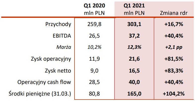 Grupa Sanok Rubber Company zanotowała w pierwszym kwartale 2021 roku ponad 303 mln zł przychodów (+17% rdr), co pozwoliło na wzrost zysku operacyjnego o 80% rok do roku, do 21,6 mln zł i wzrost marży na tym poziomie o 2,5 pkt proc., do ponad 7%. Z kolei na poziomie EBITDA marża przekroczyła 12% (+2,0 pkt proc.), co przełożyło się na 37,2 mln zł wyniku EBITDA (+40% rdr). Zysk netto wzrósł jeszcze mocniej – o ponad 83% rdr, do 16,5 mln zł.