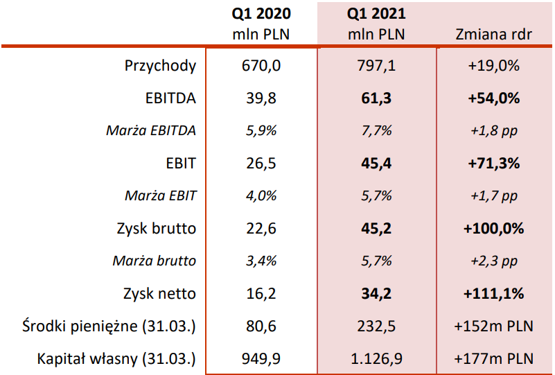 Po przekroczeniu progu 3 mld zł rocznej sprzedaży (+4% rdr) i zanotowaniu wzrostu zysku operacyjnego o jedną piątą, Grupa Amica mocnym akcentem otwiera rok 2021. W pierwszym kwartale zwiększyła przychody o 19% rdr, do 797 mln zł, rosnąc we wszystkich obszarach geograficznych. Wypracowała jednocześnie 5,7% marży EBIT (+1,7 pkt proc. rdr), co przełożyło się na 45,4 mln zł zysku operacyjnego (+71% rdr). Zysk brutto podwoił się do 45,2 mln zł, a zysk netto wzrósł o 111%, do 34,2 mln zł.