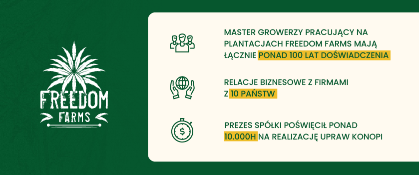 Już teraz można dołączyć do Freedom Farms w wyjątkowy sposób - stając się akcjonariuszem, a tym samym zdobywając możliwość współtworzenia historii spółki i całego rynku konopnego. W społeczności skupionej wokół konopi jest duża siła, ale i wiedza. W rynku drzemie zaś potencjał, którym chcemy zainteresować doświadczonych inwestorów spoza branży. Mamy dobrze przygotowany plan biznesowy, zakładamy m.in. budowę franczyzowej sieci showroomów, dalsze zwiększanie areału upraw i w efekcie zbudowanie rozpoznawalnej marki nie tylko w Polsce – powiedział Przemysław Zawadzki, prezes zarządu Freedom Farms SA.