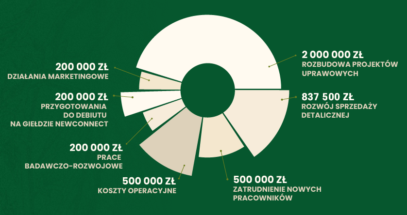 Rozbudowa projektów uprawowych: 2 000 000 zł - spółka planuje zainwestować w nowoczesne tunele uprawowe wyposażone w systemy zaciemniania i kontroli klimatu. Ponadto chce zwiększyć inwestycje w uprawy polowe oraz zakupić sprzęt do suszenia i trymowania kwiatów konopnych.