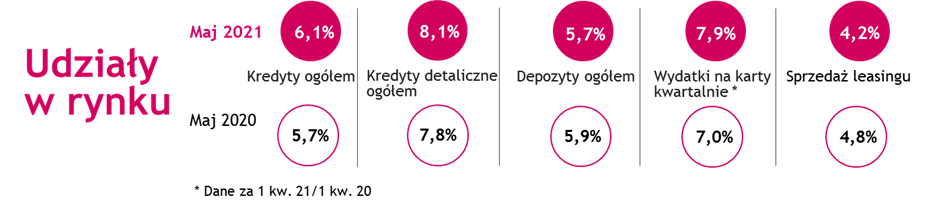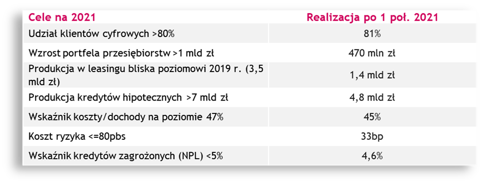 - poprawa efektywności kosztowej w wyniku stałego wzrostu ucyfrowienia naszego biznesu, jak również relacji z klientami i silnej odpowiedzi kosztowej na presje przychodowe; spadająca liczba pracowników (liczba aktywnych pracowników spadła o 881, tj. 12% od 2kw20), trwająca optymalizacja naszej sieci dystrybucji fizycznej (liczba oddziałów własnych spadła o 90 jednostek, tj. 17% w ciągu ostatnich dwunastu miesięcy) komplementarna w stosunku do rosnącego udziału usług cyfrowych (klienci cyfrowi: 2,14 mln, wzrost o 9% r/r, aktywni użytkownicy bankowości mobilnej: 1,8 mln, wzrost o 15% r/r); kosztowe działania optymalizacyjne nie tylko prowadziły do nominalnej redukcji kosztów operacyjnych, lecz również przełożyły się na znaczną poprawę efektywności kosztowej; raportowany wskaźnik koszty/dochody („K/D”) obniżył się do 41% w 2kw21 z 47% w tym samym okresie poprzedniego roku (wskaźnik K/D z wyłączeniem BFG oraz wpływu pozycji kompensujących rezerwy utworzone na walutowe kredyty hipoteczne dot. portfela b. EB obniżył się do 40% z 44%), wskaźnik koszty/aktywa obniżył się do 1,5% z 1,6%, natomiast koszty operacyjne na pracownika obniżyły się do 54 000 zł w 1poł.21 z około 57 000 w 1poł.20);
