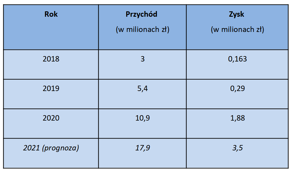 Prognozy finansowe na rok 2021 zakładają 18 mln złotych przychodu i 3,5 mln złotych zysku. Jeśli się sprawdzą, średni przychód w 11-osobowym zespole wyniesie ponad 1,5 mln złotych na pracownika. Jak zapewniają właściciele, nadal jest pole do zwiększenia efektywności przy zachowaniu komfortu pracy zespołu i... zakazu nadgodzin, który obowiązuje w firmie od kilku lat.