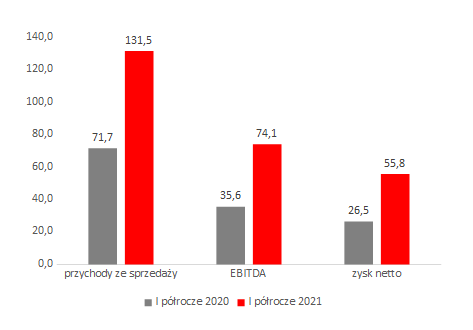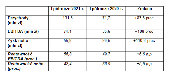 Mo-BRUK, lider polskiej branży przetwarzania odpadów przemysłowych, w I półroczu 2021 r. wypracował w ujęciu skonsolidowanym 131,5 mln zł przychodów ze sprzedaży, 74,1 mln zł EBITDA (zysku operacyjnego powiększonego o amortyzację) oraz 55,8 mln zł zysku netto. Oznacza to wzrost rok do roku odpowiednio o 83,5 proc., 108 proc. oraz 110,8 proc.