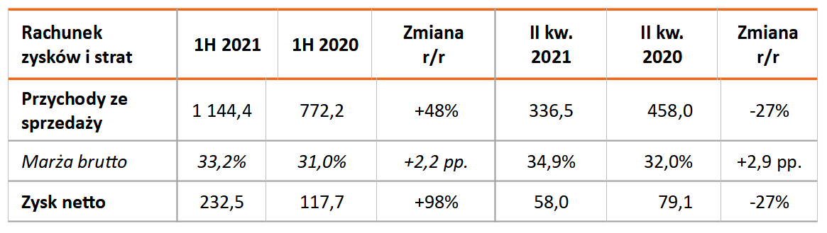 Dom Development odnotował w I półroczu 2021 roku wysoki poziom przychodów ze sprzedaży i zysku netto. W tym roku, inaczej niż w poprzednich, rozłożona została struktura przekazań, co przekłada się na bardzo dobre wyniki I kwartału i niższe wyniki II kwartału 2021.