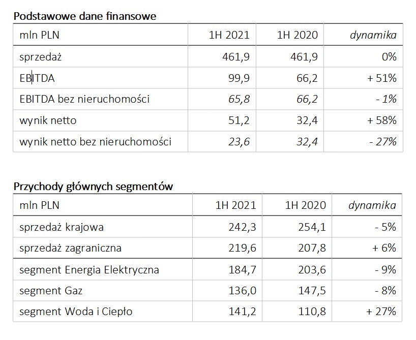 - segment Gaz – wysoka sprzedaż w kraju (+14% r/r) w wyniku realizacji przetargu dla PSG, przy jednocześnie niższym eksporcie (-15% r/r), w efekcie wysokiej bazy w 1H 2020. Wpływ na niższy backlog ma kończący się rollout na gazomierze inteligentne w Niderlandach oraz przejściowe obniżenie zamówień od kluczowych partnerów, głównie na rynku brytyjskim, spowodowane sytuacją epidemiczną. Jednocześnie, na wybranych rynkach (Węgry, Turcja, Ukraina) uzyskano wzrosty sprzedaży, przy czym jedne z największych notowane są na rynku belgijskim, gdzie trwa obecnie wymiana gazomierzy na inteligentne, a wygrany kolejny istotny przetarg na tym rynku zapewni stabilne przychody w następnych latach.