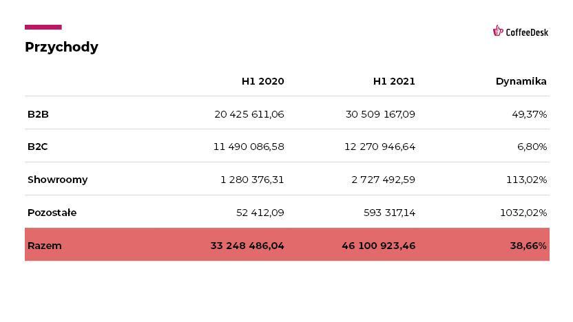 Dzięki działalności opartej o kilka zróżnicowanych obszarów osiągnęliśmy wyniki nie tylko satysfakcjonujące, ale wręcz znacznie przekraczające nasze plany, czyli wzrost przychodów 44% r/r. Wysokie wzrosty odnotowaliśmy we wszystkich kanałach sprzedaży, zwłaszcza B2C i B2B. Pierwsza połowa 2021 r. przyniosła zaś rekordowy wzrost w segmencie showroomów – powiedział Łukasz Wichłacz, CEO Coffeedesk.
