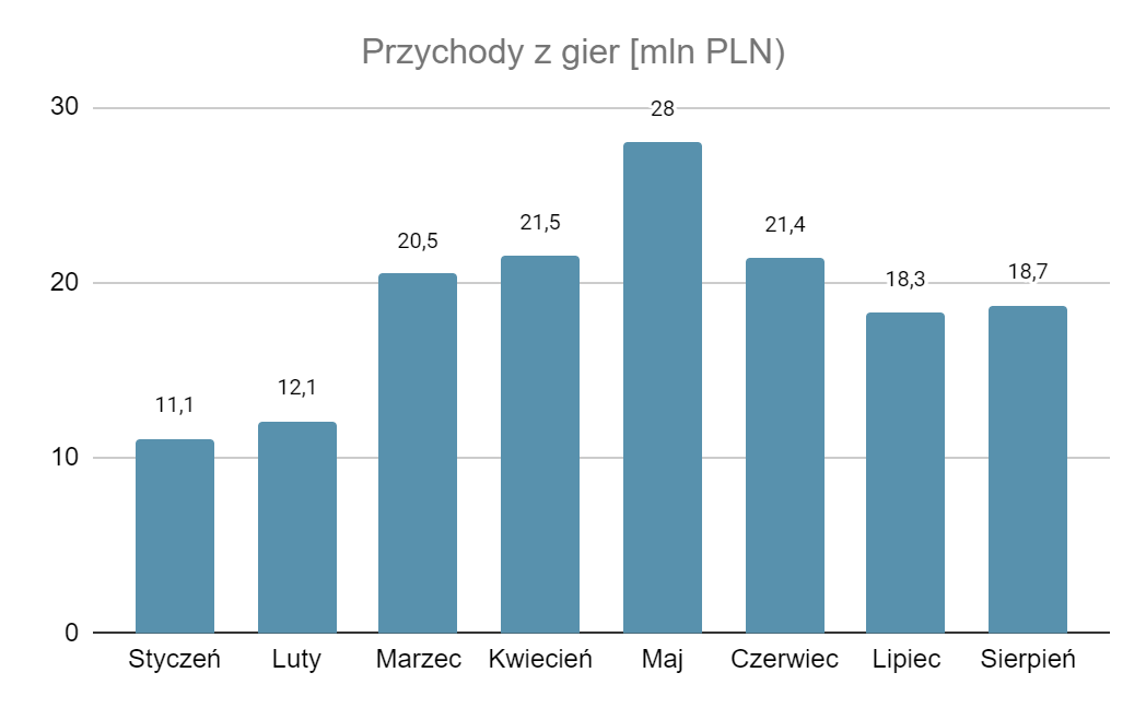 W sierpniu 2021 r. Grupa BoomBit miała 18,71 mln zł przychodów (+2% m/m). Koszty marketingu wyniosły 10,18 mln PLN (+5% m/m), a koszty prowizji platform 1,23 mln PLN (+19% m/m). Przychody pomniejszone o UA i prowizje platform wyniosły w sierpniu 7,29 mln PLN (-3%). Łączna liczba pobrań gier Grupy BoomBit to 23,4 mln.