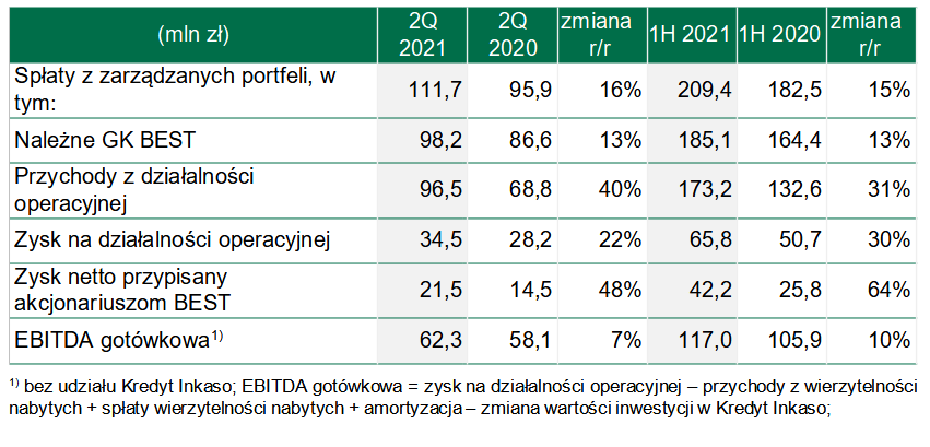 W pierwszym półroczu 2021 r. łączne spłaty z zarządzanych przez GK BEST portfeli wierzytelności sięgnęły 209,4 mln zł i były o 15% wyższe niż w tym samym okresie 2020 r. GK BEST zanotowała również wzrost kluczowych wyników finansowych: przychody z działalności operacyjnej wyniosły 173,2 mln zł (+31% r/r), EBITDA gotówkowa sięgnęła 117 mln zł (+10% r/r), a zysk netto przypisany akcjonariuszom BEST wyniósł 42,2 mln zł (+64% r/r). Wskaźnik zadłużenia netto do kapitałów własnych na koniec czerwca 2021 r. spadł do poziomu 0,64 – najniższego od blisko 7 lat.