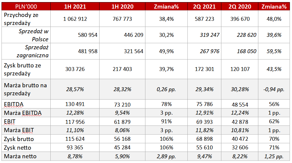 W samym II kwartale 2021 Grupa przy 48-proc. wzroście sprzedaży (do 587,2 mln zł) wypracowała zysk netto na poziomie 55,6 mln zł, co oznacza wzrost o 71% r/r. Rentowność Grupy w II kwartale 2021, w ujęciu wartościowym, wzrosła na wszystkich poziomach.
