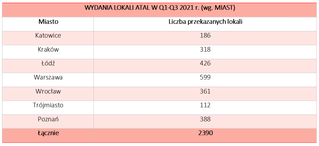 ATAL po 3 kwartałach 2021 wydał łącznie 2390 lokali, co oznacza wzrost o 34% rdr. Najwięcej lokali zostało wydanych w Warszawie (599), Łodzi (426) i Poznaniu (388).