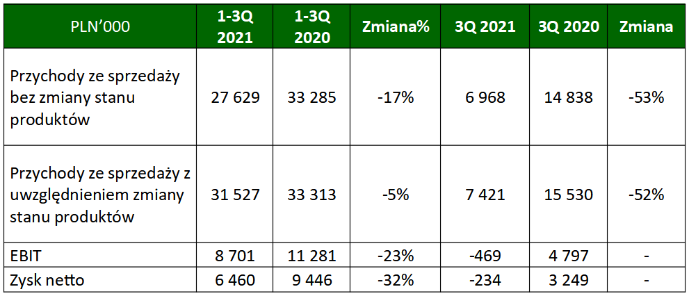 BLIRT SA – firma biotechnologiczna specjalizująca się w wytwarzaniu wysokiej jakości enzymów i odczynników wykorzystywanych w globalnej diagnostyce, zakończyła okres trzech kwartałów 2021 roku spadkiem przychodów ze sprzedaży do 27,6 mln zł (-17% r/r). Sprzedaż produktów własnych, które są dla Spółki strategiczne została utrzymana na dobrym poziomie, choć niższym rok do roku o 4%. Sprzedaż eksportowa po 9 miesiącach stanowiła dominującą część sprzedaży BLIRT. Zysk netto Spółki po dziewięciu miesiącach wyniósł 6,5 mln zł wobec 9,5 mln zł rok wcześniej, co oznacza spadek o 32% r/r.