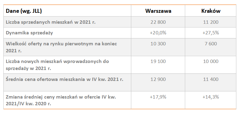 Kraków to drugie największe miasto w Polsce o populacji ok. 780 tys. mieszkańców. To także drugi największy rynek mieszkaniowy w kraju. Sprzedaż w Krakowie w 2021 roku przekroczyła poziom 11,2 tys. mieszkań, co oznacza 27,5-proc. wzrost rok do roku. Średnia cena ofertowa w Krakowie na koniec IV kw. 2021 wynosiła 11,4 tys. zł, czyli kształtowała się na poziomie zbliżonym do Trójmiasta.