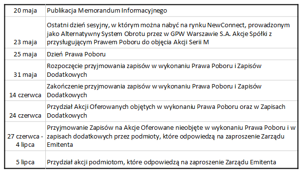 W ramach emisji Spółka planuje wyemitować nie więcej niż 6 335 580 akcji serii M po cenie 0,24 zł każda. Za każdą jedną akcję Spółki posiadaną na koniec dnia ustalenia prawa poboru akcjonariuszowi przysługuje jedno jednostkowe prawo poboru. Trzy jednostkowe prawa poboru uprawniają do objęcia dwóch akcji serii M. Akcje serii M objęte zapisami dodatkowymi Zarząd przydziela proporcjonalnie do zgłoszeń. Pozostałe akcje Zarząd przydzieli według swojego uznania po cenie nie niższej niż emisyjna.