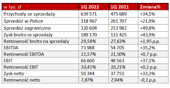 Analizując nasze wyniki finansowe za I kwartał 2022 r. warto zwrócić uwagę na dwa czynniki. Po pierwsze, rentowność marży brutto ze sprzedaży nadal utrzymuje pozytywny trend z poprzednich kwartałów. Co więcej, w I kwartale br. osiągnęła ona znacznie wyższy poziom w porównaniu do analogicznego okresu poprzedniego roku – wzrost do 29,6% z 27,6%. Po drugie, za wzrost Grupy istotnie odpowiadała także nasza sprzedaż zagraniczna, która urosła blisko 50% rok do roku. Po raz pierwszy w historii nasza sprzedaż zagraniczna była nieznacznie większa niż sprzedaż krajowa. Dynamika sprzedaży w Polsce także była wysoka i wyniosła 21,9% – dodaje Aleksander Górecki, Prezes Zarządu Auto Partner S.A.