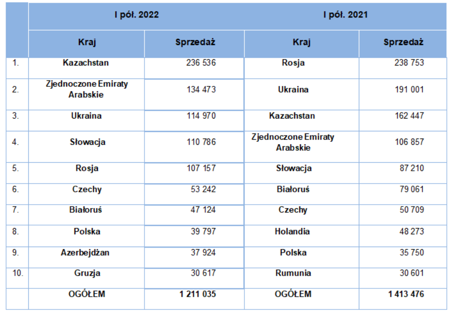 Analiza według krajów potwierdza, że znaczny spadek sprzedaży odnotowano na rynkach bezpośrednio dotkniętych wojną w Ukrainie. Spadek na Ukrainie był jednym z najwyższych. W rezultacie przychody zrealizowane w tym kraju spadły o 39,8% w I półroczu 2022 r. w porównaniu do analogicznego okresu 2021 r. Przychody wypracowane na dotychczas największym rynku Grupy – Rosji – spadły o 55,1% w I półroczu 2022 r. w porównaniu do analogicznego okresu 2021 roku. Z drugiej jednak strony, Spółka była w stanie znacznie zwiększyć sprzedaż na rynkach, które nie zostały bezpośrednio dotknięte wojną w Ukrainie, takich jak Kazachstan – obecnie największy rynek Grupy, na którym przychody wzrosły o 45,6% w porównaniu do I półrocza 2021 r.
