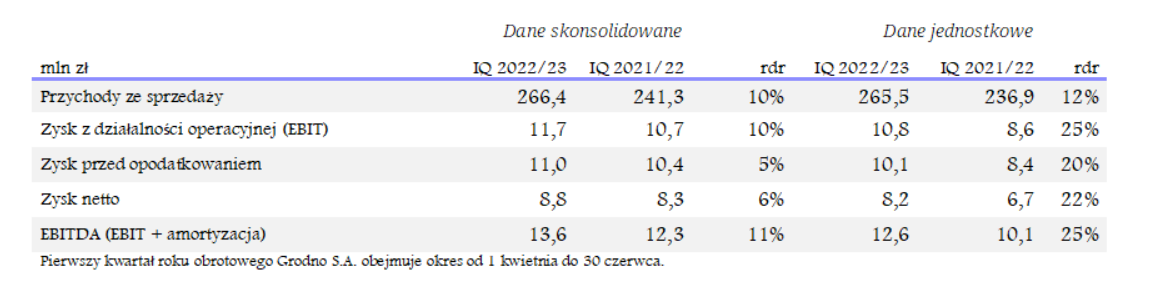 Grodno zwiększyło przychody o 10% rdr, zysk netto o 6% rdr w pierwszym kwartale roku obrotowego 2022/23
